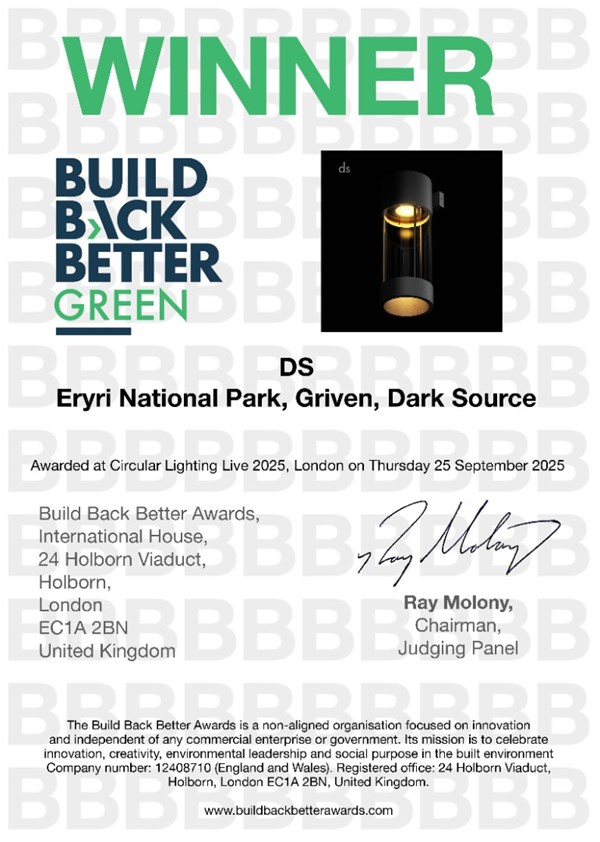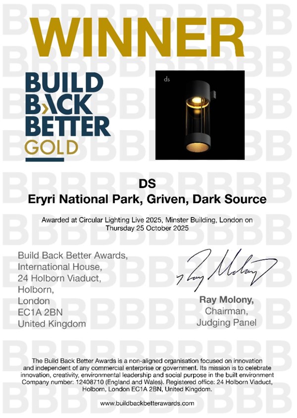 The Build Back Better Awards celebrate innovation, creativity, environmental leadership, and social purpose in the built environment. Winners were announced at the presentation ceremony at Circular Lighting Live 2025 on Thursday 25 September at the Minster Building in the City of London. This brand-new, soon upcoming release, has deserved two Build Back Better awards being recognised both for its exceptional innovation and technological advancement (Gold) and for its commitment to circular economy principles and sustainability (Green).